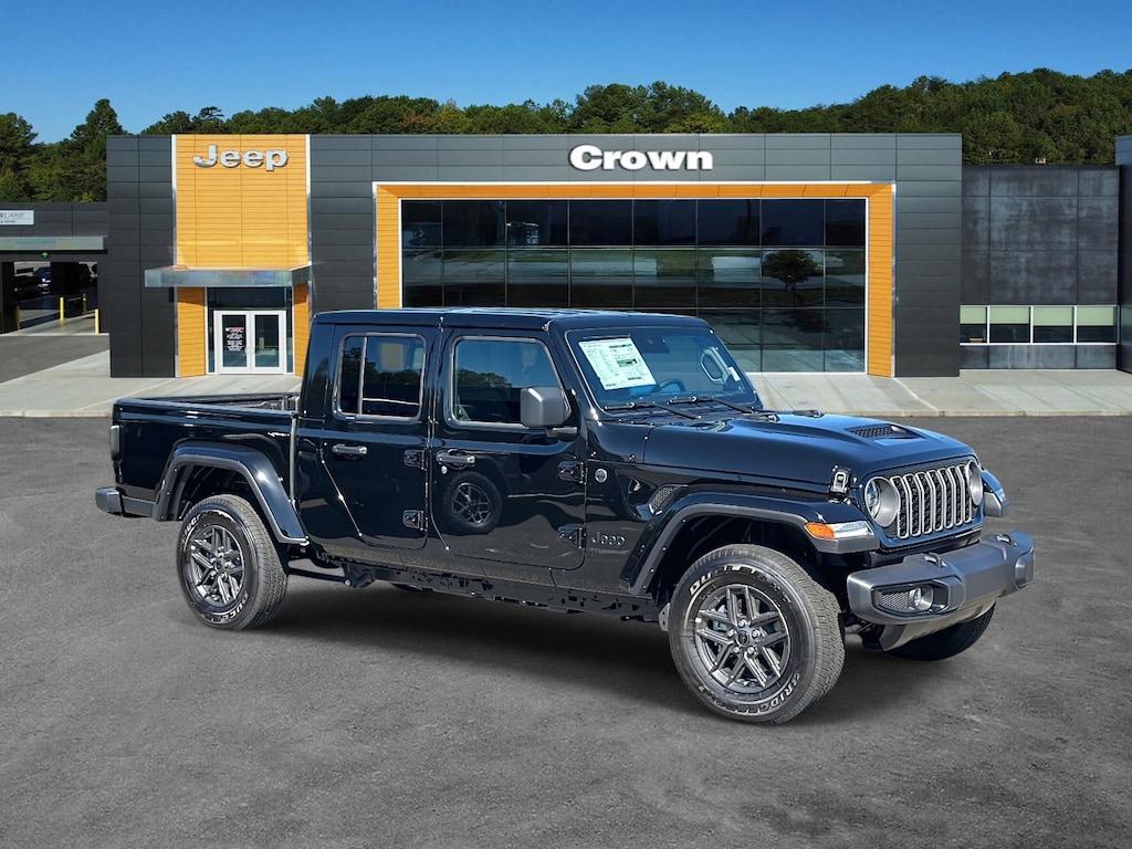 110 MPH Vehicle Max Speed Calibration, 115V Auxiliary Power Outlet, 12.3" Touchscreen Display, 3.73 Rear Axle Ratio, 4-Wheel Disc Brakes, 400W Inverter, 4G LTE Wi-Fi Hot Spot, 8 Speakers, ABS brakes, Advanced Brake Assist, Air Conditioning, Alexa Built-In, Alpine Premium Audio System, AM/FM radio: SiriusXM, Apple CarPlay, Apple CarPlay/Android Auto, Auto-Dimming Rear-View Mirror, Automatic Headlamps, Bluetooth Wireless Speaker, Body Color 3-Piece Hard Top, Body Color Fender Flares (2-Piece), Brake assist, Cloth Low-Back Bucket Seats, Compass, Connected Travel & Traffic Services, Connectivity - US/Canada, Convenience Group, Corning Gorilla Glass, Dark Sky Appearance Package, Daytime Running Lamp System, Daytime Running Lamps LED Accents, Deep Tint Sunscreen Windows, Delay-off headlights, Driver door bin, Driver vanity mirror, Dual front impact airbags, Dual front side impact airbags, Electronic Stability Control, Emergency/Assistance Call, Enhanced Adaptive Cruise Control, Freedom Panel Storage Bag, Front anti-roll bar, Front Bucket Seats, Front Center Armrest w/Storage, Front Door Locks 2-Door Passive Entry, Front fog lights, Front LED Fog Lamps, Front License Plate Bracket, Front reading lights, Full Speed Forward Collision Warning Plus, Google Android Auto, GPS Antenna Input, GPS Navigation, HD Radio, Heated Front Seats, Heated Steering Wheel, Illuminated entry, Integrated Center Stack Radio, Integrated roll-over protection, Integrated Voice Command w/Bluetooth, LED Headlamp & Fog Lamp Group, LED Premium Reflector Headlamps, Low tire pressure warning, Media Hub w/2 Charge Only USBs, Mold In Color Bumper w/Gloss Black, MOPAR Spray In Bedliner, Normal Duty Plus Suspension, Normal Duty Suspension, Occupant sensing airbag, Outside temperature display, Overhead airbag, Panic alarm, ParkView Rear Back-Up Camera, Passenger door bin, Passenger vanity mirror, Performance Hood, Power Heated Mirrors, Power steering, Power windows, Premium Wrapped Steering Wheel, Quick Order Package 24S Sport S, Radio data system, Radio: Uconnect 5 Nav w/12.3" Display, Radio: Uconnect 5 w/12.3" Display, Rear anti-roll bar, Rear reading lights, Rear Sliding Window, Rear Window Defroster, Remote keyless entry, Remote Start System, Security Alarm, SiriusXM Radio Service, SiriusXM w/360L, Speed control, Split folding rear seat, Steering wheel mounted audio controls, Sun Visors w/Illuminated Vanity Mirrors, Tachometer, Technology Group, Telescoping steering wheel, Tilt steering wheel, Traction control, Trip computer, Universal Garage Door Opener, USB Host Flip, Variably intermittent wipers, Voltmeter, Wheels: 17" x 7.5" Black Steel Styled, Wheels: 17" x 7.5" Gray. 2025 Jeep Gladiator Sport S Sport S Black Clearcoat 4WD 8-Speed Automatic 3.6L V6 24V VVT