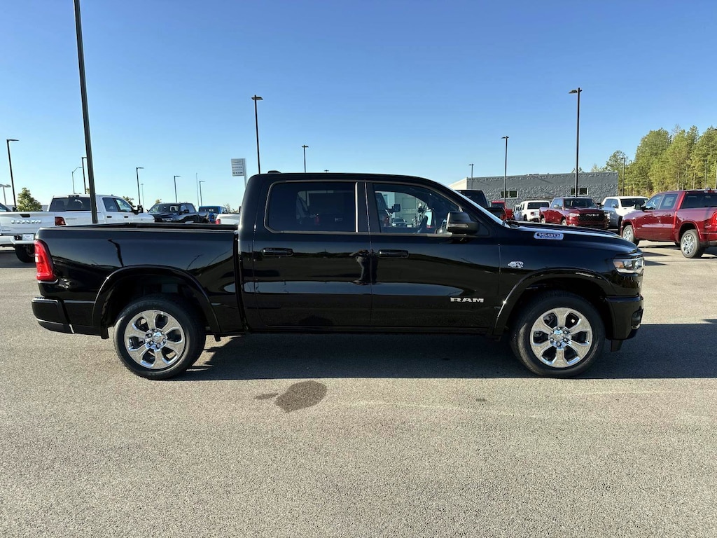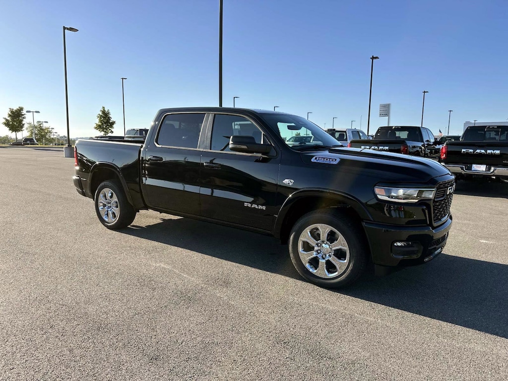 115V Auxiliary Power Outlet, 115V Auxiliary Rear Power Outlet, 12" Touchscreen Display, 2nd Row In Floor Storage Bins, 3 Rear Seat Head Restraints, 33 Gallon Fuel Tank, 4 Way Front Headrests, 4-Wheel Disc Brakes, 400W Inverter, 48V Belt Starter Generator, 4G LTE Wi-Fi Hot Spot, 6 Speakers, 9 Amplified Speakers w/Subwoofer, ABS brakes, Air Conditioning, Air Conditioning ATC w/Dual Zone Control, Alloy wheels, AM/FM radio, Apple CarPlay, Apple CarPlay/Android Auto, Auto High-beam Headlights, Auto Power-Folding Mirrors, Auto-Dimming Exterior Driver Mirror, Auto-Dimming Rear-View Mirror, Big Horn Level 2 Equipment Group, Black Exterior Mirrors, Black Interior Accents, Black Premium Power Mirrors, Body Color Door Handles, Body Color Fender Flares, Body Color Front Bumper, Body Color Rear Bumper w/Step Pads, Body Color Tailgate Handle, Brake assist, Bucket Seats, Bumpers: chrome, Center Console Parts Module, Cloth Bucket Seats, Cluster 7.0" TFT Color Display, Compass, Configurable Drive Mode, Connected Travel & Traffic Services, Connectivity - US/Canada, Convex Wide-Angle Exterior Mirror Insert, Delay-off headlights, Deluxe Cloth Bucket Seats, Disassociated Touchscreen Display, Driver door bin, Dual front impact airbags, Dual front side impact airbags, Electronic Stability Control, Exterior Mirrors Courtesy Lamps, Exterior Mirrors w/Heating Element, Exterior Mirrors w/Supplemental Signals, Front anti-roll bar, Front Bucket Seats, Front Center Armrest w/Storage, Front fog lights, Front reading lights, Front Seat Back Map Pockets, Front wheel independent suspension, Full Length Floor Console, Fully automatic headlights, Global Telematics Box Module (TBM), Glove Box Lamp, Google Android Auto, GPS Antenna Input, GPS Navigation, Grille Surround 1 Body Color Texture 1 Black, HD Radio, Heated door mirrors, Heated Front Seats, Heated Steering Wheel, Illuminated entry, Integrated Center Stack Radio, Integrated Voice Command w/Bluetooth, Leather Wrapped Steering Wheel, LED Dome Lamp w/On/Off Switch, LED Footwell Lighting, Low tire pressure warning, Manual Adjust 4-Way Driver Seat, Manual Adjust 4-Way Front Passenger Seat, Manual Folding Exterior Mirrors, Media Hub w/2 Charge Only USBs, MOPAR Front & Rear Rubber Floor Mats, Occupant sensing airbag, Outside temperature display, Overhead airbag, Overhead console, Overhead LED Lamps, Panic alarm, ParkView Rear Back-Up Camera, Passenger door bin, Passenger vanity mirror, Power 2-Way Driver Lumbar Adjust, Power Adjust 8-Way Driver Seat, Power Adjustable Pedals, Power door mirrors, Power steering, Power windows, Premium Overhead Console, Quick Order Package 27Z Big Horn, Radio data system, Radio: Uconnect 5 Nav w/12.0" Display, Radio: Uconnect 5 W w/8.4" Display, RAM Grille Badge - Chrome, Rear 60/40 Folding Seat, Rear anti-roll bar, Rear Center Armrest, Rear Power Sliding Window, Rear step bumper, Rear Wheelhouse Liners, Rear Window Defroster, Remote keyless entry, Remote Tailgate Release, Secondary Active Grille Shutters, Security Alarm, SiriusXM Radio Service, SiriusXM w/360L, Speed control, Sport Appearance Package, Steering Wheel Mounted Audio Controls, Sun Visors w/Illuminated Vanity Mirrors, Supplier Part Tracking (J-1), Tachometer, Telescoping steering wheel, Tilt steering wheel, Traction control, Trip computer, Universal Garage Door Opener, USB Host Flip, Variably intermittent wipers, Voltmeter, Wheels: 18" x 8" Cast-Aluminum Painted, Wheels: 20" x 9" Aluminum Chrome Clad (WRD), Wheels: 20" x 9" Aluminum Chrome Clad (WRK), Wireless Charging Pad. 2026 Ram 1500 Big Horn/Lone Star Big Horn/Lone Star Diamond Black Crystal Pearlcoat 4WD 8-Speed Automatic HEMI 5.7L V8 Multi Displacement VVT eTorque
